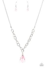A glassy pink teardrop swings from the bottom of a chunky silver chain that attaches to a shimmery silver popcorn chain, creating a modern display below the collar. Sold as one individual necklace. Includes one pair of matching earrings.