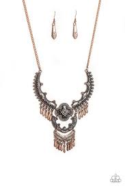 A collection of antiqued copper plates connects below the collar, joining into an elaborate pendant. The floral dotted frames give way to sections of copper beaded fringe, adding hints of movement to the tribal inspired piece.